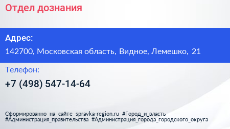 Отдел дознания по адресу 142700, Московская область, Видное, Лемешко, 21 в дальнейшем Организация, размещена в следующих категориях: