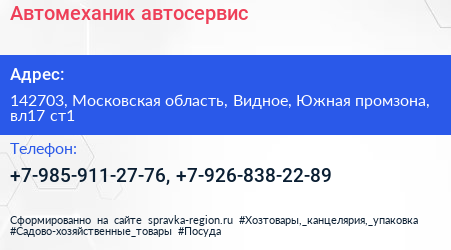 Автомеханик, автосервис по адресу 142703, Московская область, Видное, Южная промзона, вл17 ст1 в дальнейшем Организация, размещена в следующих категориях: