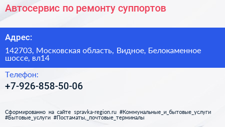 Автосервис по ремонту суппортов по адресу 142703, Московская область, Видное, Белокаменное шоссе, вл14 в дальнейшем Организация, размещена в следующих категориях: