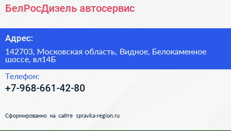 БелРосДизель, автосервис по адресу 142703, Московская область, Видное, Белокаменное шоссе, вл14Б в дальнейшем Организация, размещена в следующих категориях: