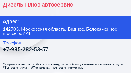 Дизель-Плюс, автосервис по адресу 142703, Московская область, Видное, Белокаменное шоссе, вл14Б в дальнейшем Организация, размещена в следующих категориях: