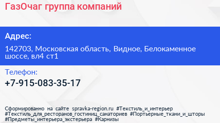 ГазОчаг, группа компаний по адресу 142703, Московская область, Видное, Белокаменное шоссе, вл4 ст1 в дальнейшем Организация, размещена в следующих категориях: