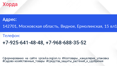 Хорда по адресу 142701, Московская область, Видное, Ермолинская, 15 вл1 в дальнейшем Организация, размещена в следующих категориях: