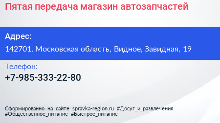 Пятая передача, магазин автозапчастей по адресу 142701, Московская область, Видное, Завидная, 19 в дальнейшем Организация, размещена в следующих категориях: