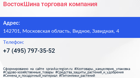 ВостокШина, торговая компания по адресу 142701, Московская область, Видное, Завидная, 4 в дальнейшем Организация, размещена в следующих категориях: