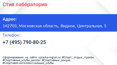 Стив, лаборатория по адресу 142703, Московская область, Видное, Центральная, 5 в дальнейшем Организация, размещена в следующих категориях: