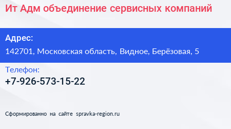 Ит-Адм, объединение сервисных компаний по адресу 142701, Московская область, Видное, Берёзовая, 5 в дальнейшем Организация, размещена в следующих категориях: