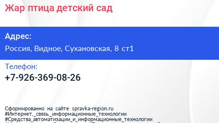 Жар-птица, детский сад по адресу 8 с1, Сухановская улица, Жилой комплекс «Государев дом», Лопатино, Ленинский городской округ, Московская область, Центральный федеральный округ, 142710, Россия в дальнейшем Организация, размещена в следующих категориях: