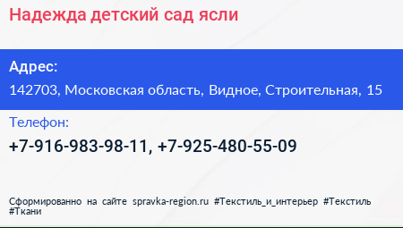 Надежда, детский сад-ясли по адресу 142703, Московская область, Видное, Строительная, 15 в дальнейшем Организация, размещена в следующих категориях: