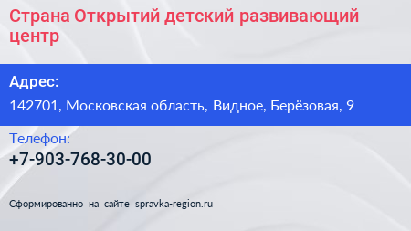 Страна Открытий, детский развивающий центр по адресу 142701, Московская область, Видное, Берёзовая, 9 в дальнейшем Организация, размещена в следующих категориях: