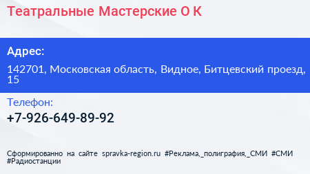 Театральные Мастерские О.К. по адресу 142701, Московская область, Видное, Битцевский проезд, 15 в дальнейшем Организация, размещена в следующих категориях:
