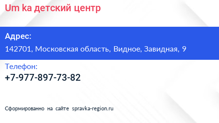 Um-ka, детский центр по адресу 142701, Московская область, Видное, Завидная, 9 в дальнейшем Организация, размещена в следующих категориях: