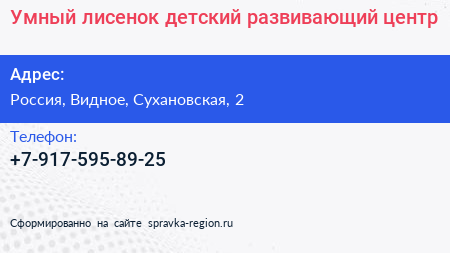 Умный лисенок, детский развивающий центр по адресу 2, Сухановская улица, Жилой комплекс «Государев дом», Лопатино, Ленинский городской округ, Московская область, Центральный федеральный округ, 142710, Россия в дальнейшем Организация, размещена в следующих категориях:
