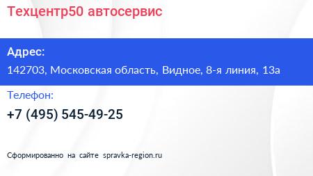 Техцентр50, автосервис по адресу 142703, Московская область, Видное, 8-я линия, 13а в дальнейшем Организация, размещена в следующих категориях: