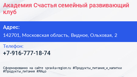 Академия Счастья, семейный развивающий клуб по адресу 142701, Московская область, Видное, Ольховая, 2 в дальнейшем Организация, размещена в следующих категориях: