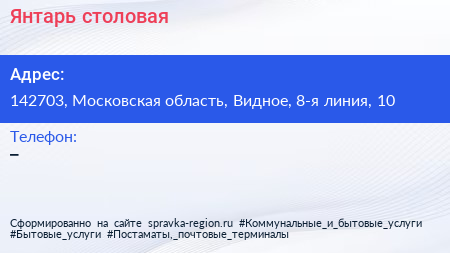 Янтарь, столовая по адресу 142703, Московская область, Видное, 8-я линия, 10 в дальнейшем Организация, размещена в следующих категориях: