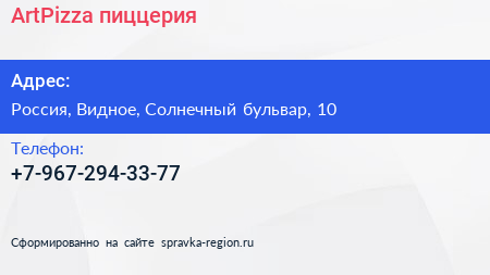 ArtPizza, пиццерия по адресу 10, Солнечный бульвар, Жилой комплекс «Государев дом», Лопатино, Ленинский городской округ, Московская область, Центральный федеральный округ, 142710, Россия в дальнейшем Организация, размещена в следующих категориях: