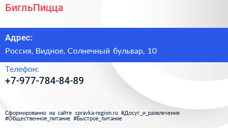 БигльПицца по адресу Ароматный мир, 10, Солнечный бульвар, Жилой комплекс «Государев дом», Лопатино, Ленинский городской округ, Московская область, Центральный федеральный округ, 142710, Россия в дальнейшем Организация, размещена в следующих категориях: