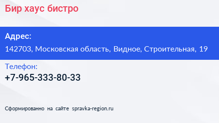 Бир хаус, бистро по адресу 142703, Московская область, Видное, Строительная, 19 в дальнейшем Организация, размещена в следующих категориях: