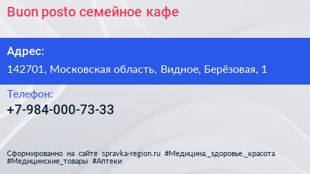 Buon posto, семейное кафе по адресу 142701, Московская область, Видное, Берёзовая, 1 в дальнейшем Организация, размещена в следующих категориях: