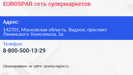 EUROSPAR, сеть супермаркетов по адресу 142701, Московская область, Видное, проспект Ленинского Комсомола, 1в в дальнейшем Организация, размещена в следующих категориях: