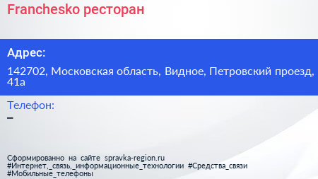 Franchesko, ресторан по адресу 142702, Московская область, Видное, Петровский проезд, 41а в дальнейшем Организация, размещена в следующих категориях: