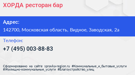 ХОРДА, ресторан-бар по адресу 142700, Московская область, Видное, Заводская, 2а в дальнейшем Организация, размещена в следующих категориях: