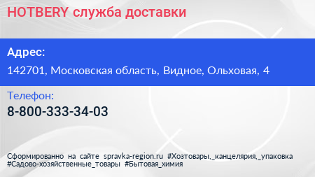 HOTBERY, служба доставки по адресу 142701, Московская область, Видное, Ольховая, 4 в дальнейшем Организация, размещена в следующих категориях: