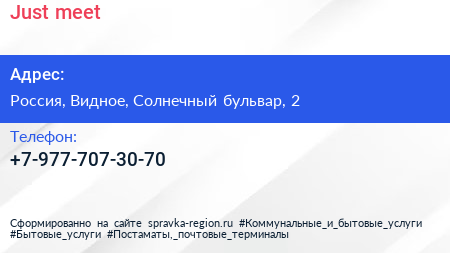 Just meet по адресу 2, Солнечный бульвар, Жилой комплекс «Государев дом», Лопатино, Ленинский городской округ, Московская область, Центральный федеральный округ, 142710, Россия в дальнейшем Организация, размещена в следующих категориях: