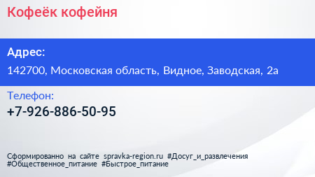 Кофеёк, кофейня по адресу 142700, Московская область, Видное, Заводская, 2а в дальнейшем Организация, размещена в следующих категориях: