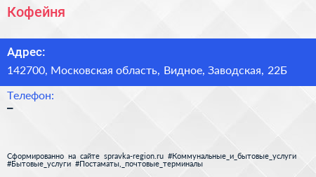 Кофейня по адресу 142700, Московская область, Видное, Заводская, 22Б в дальнейшем Организация, размещена в следующих категориях: