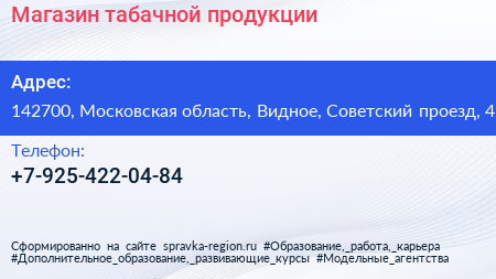 Магазин табачной продукции по адресу 142700, Московская область, Видное, Советский проезд, 4 в дальнейшем Организация, размещена в следующих категориях: