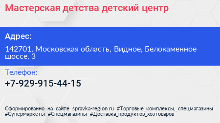 Мастерская детства, детский центр по адресу 142701, Московская область, Видное, Белокаменное шоссе, 3 в дальнейшем Организация, размещена в следующих категориях: