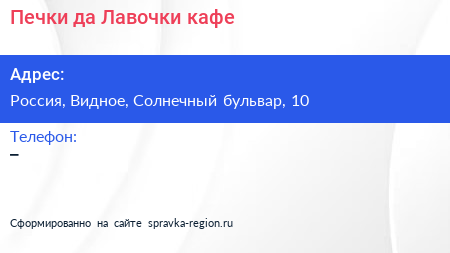 Печки да Лавочки, кафе по адресу Ароматный мир, 10, Солнечный бульвар, Жилой комплекс «Государев дом», Лопатино, Ленинский городской округ, Московская область, Центральный федеральный округ, 142710, Россия в дальнейшем Организация, размещена в следующих категориях: