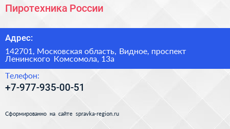 Пиротехника России по адресу 142701, Московская область, Видное, проспект Ленинского Комсомола, 13а в дальнейшем Организация, размещена в следующих категориях: