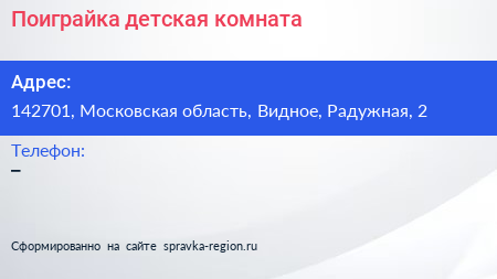 Поиграйка, детская комната по адресу 142701, Московская область, Видное, Радужная, 2 в дальнейшем Организация, размещена в следующих категориях: