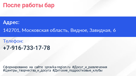 После работы, бар по адресу 142701, Московская область, Видное, Завидная, 6 в дальнейшем Организация, размещена в следующих категориях: