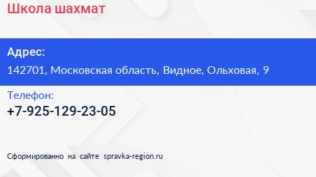 Школа шахмат по адресу 142701, Московская область, Видное, Ольховая, 9 в дальнейшем Организация, размещена в следующих категориях: