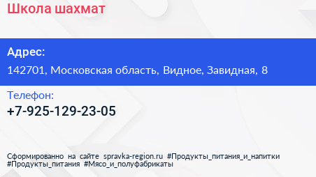 Школа шахмат по адресу 142701, Московская область, Видное, Завидная, 8 в дальнейшем Организация, размещена в следующих категориях: