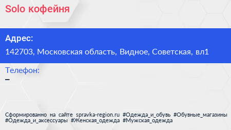 Solo, кофейня по адресу 142703, Московская область, Видное, Советская, вл1 в дальнейшем Организация, размещена в следующих категориях: