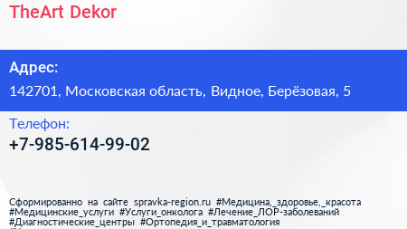 TheArt Dekor по адресу 142701, Московская область, Видное, Берёзовая, 5 в дальнейшем Организация, размещена в следующих категориях: