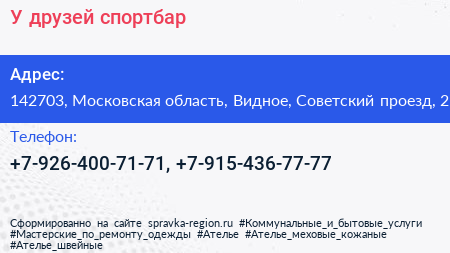 У друзей, спортбар по адресу 142703, Московская область, Видное, Советский проезд, 2 в дальнейшем Организация, размещена в следующих категориях: