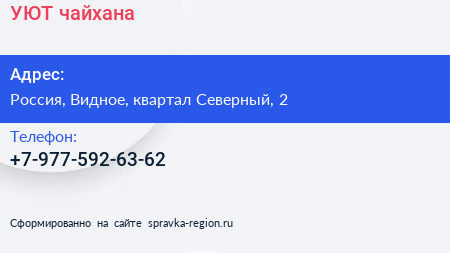 УЮТ, чайхана по адресу Торговый центр "ЭкоВидное", 2, квартал Северный, Эко Видное, Сапроново, Ленинский городской округ, Московская область, Центральный федеральный округ, 142701, Россия в дальнейшем Организация, размещена в следующих категориях: