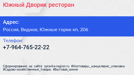 Южный Дворик, ресторан по адресу 4-й квартал, Архитектурный пригород «Южная долина», микрорайон Южные горки, Мещерино, Ленинский городской округ, Московская область, Центральный федеральный округ, 142034, Россия в дальнейшем Организация, размещена в следующих категориях: