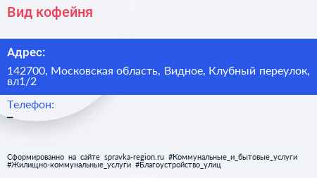 Вид, кофейня по адресу 142700, Московская область, Видное, Клубный переулок, вл1/2 в дальнейшем Организация, размещена в следующих категориях: