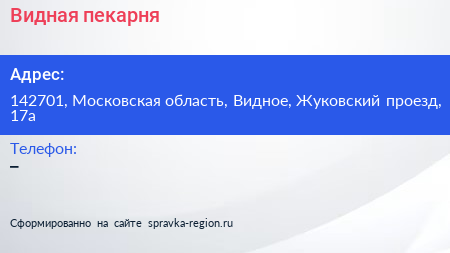 Видная, пекарня по адресу 142701, Московская область, Видное, Жуковский проезд, 17а в дальнейшем Организация, размещена в следующих категориях: