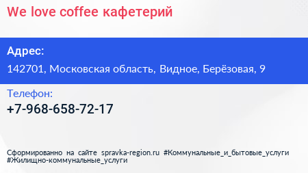 We love coffee, кафетерий по адресу 142701, Московская область, Видное, Берёзовая, 9 в дальнейшем Организация, размещена в следующих категориях: