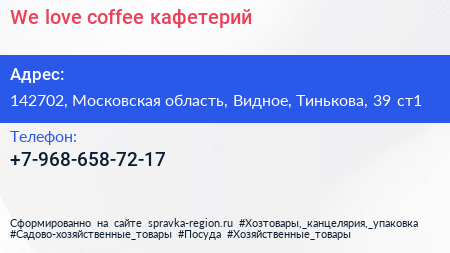 We love coffee, кафетерий по адресу 142702, Московская область, Видное, Тинькова, 39 ст1 в дальнейшем Организация, размещена в следующих категориях: