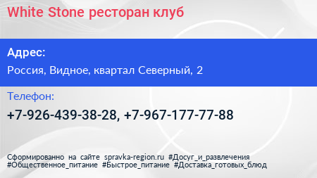 White Stone, ресторан-клуб по адресу Торговый центр "ЭкоВидное", 2, квартал Северный, микрорайон Купелинка, 6-й микрорайон, Ленинский городской округ, Московская область, Центральный федеральный округ, 152701, Россия в дальнейшем Организация, размещена в следующих категориях: