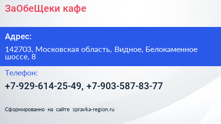 ЗаОбеЩеки, кафе по адресу 142703, Московская область, Видное, Белокаменное шоссе, 8 в дальнейшем Организация, размещена в следующих категориях: